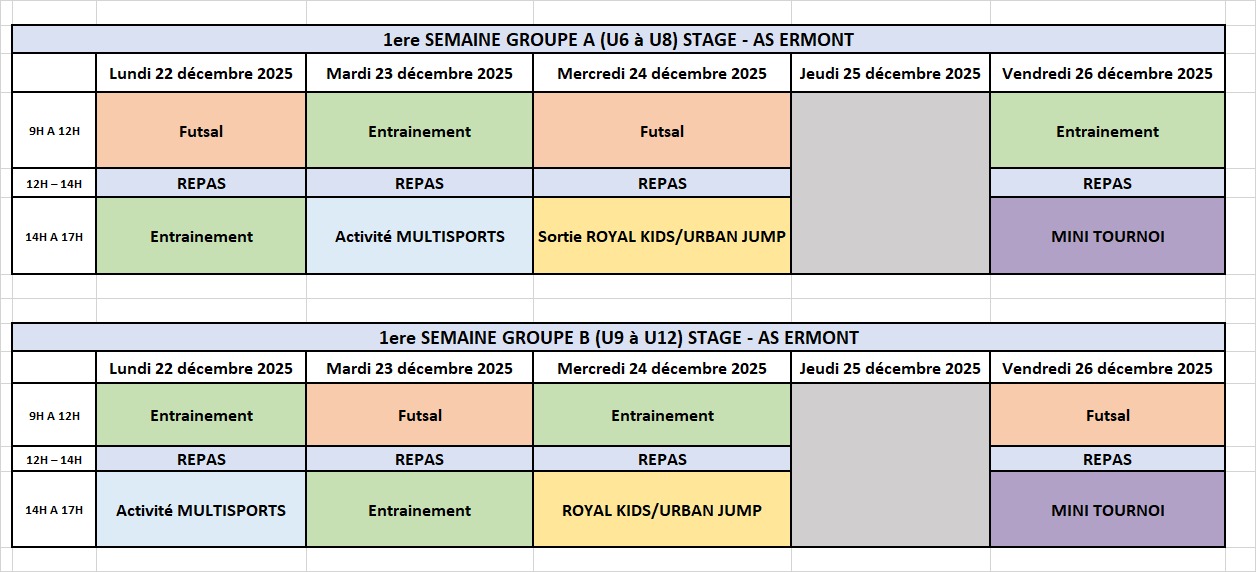 L’AS Ermont organise pendant les vacances scolaires du Lundi 22 décembre 2025 au Vendredi 26 décembre 2025 (hors jeudi 25 décembre férié) un stage à l’intention des catégories suivantes :
